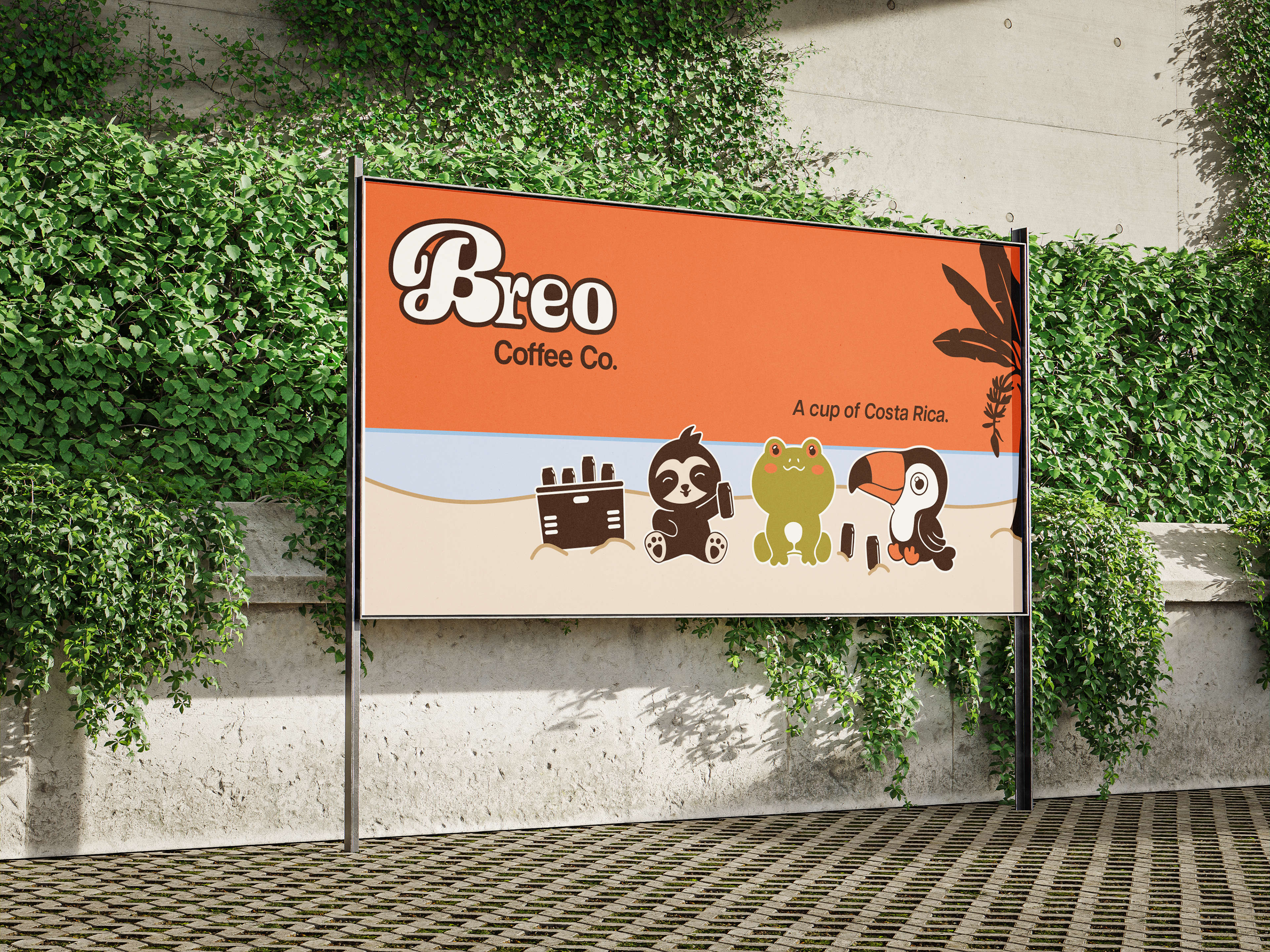 A Costa Rican coffee brand that celebrates the region’s vibrant culture through saturated, tropical-inspired visuals and friendly animal mascots, inviting consumers to slow down and savor every sip. The bold, fluid logotype evokes the sensation of pouring a cup of coffee, while the color palette captures the essence of Costa Rica’s beaches: from the blazing orange sun and crystal-clear waters to lush green foliage and the rich brown coffee in hand.